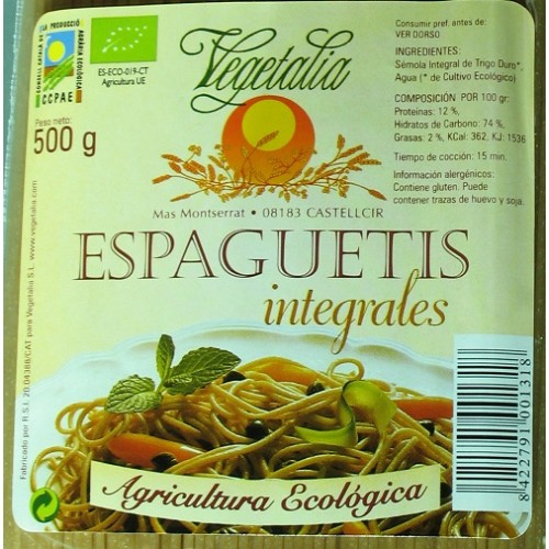 Espaguetis integrales ecológicos 500gr. de VEGETALIA. Compuestos de Sémola integral de trigo duro.