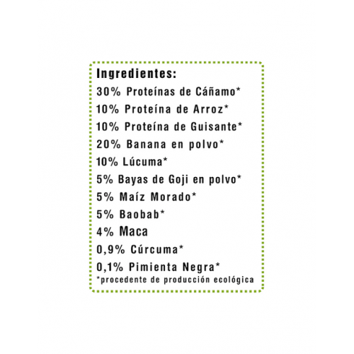 La base de esta mezcla son 3 Proteínas Veganas (Arroz, Guisante y Cáñamo) con 4 SuperAlimentos, Banana en polvo, y complementándola con MACA y una mezcla de especias.