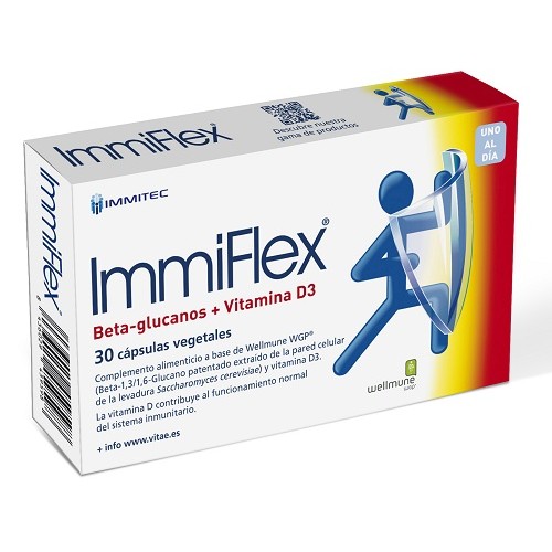 Immiflex Defensas, Beta-Glucanos, Vitamina D3. 30 cápsulas de VITAE. Immiflex es un complemento a base de Beta-1,3/1,6-glucano procedente de la paret celular de la levadura Saccharomyces cerevisiae (Wellmune WGP®) y vitamina D3