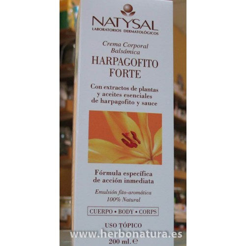 Harpagofito Forte Crema Corporal balsámica 200ml. de NATYSAL. Crema balsámica de acción calmante, con aceites esenciales y extractos de plantas 100% puros, que ejercen una acción defatigante y apaciguante muscular.